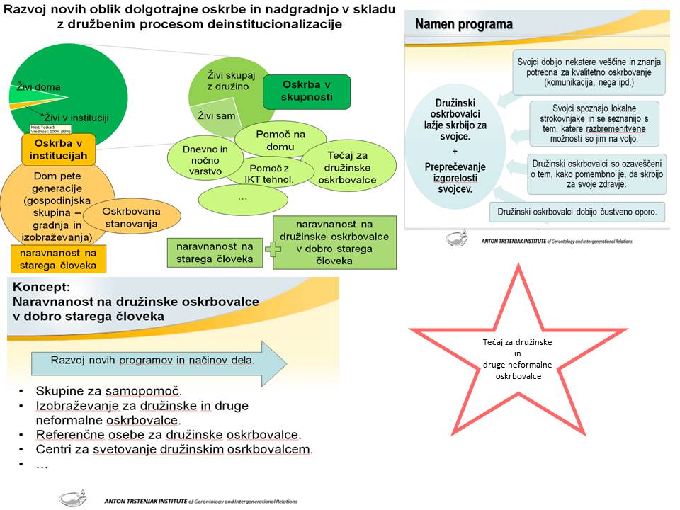 Inštitut Antona Trstenjaka je zadolžen za implementacijo treh: za družinske oskrbovalce, za prostovoljce in za organizatorje mreže.